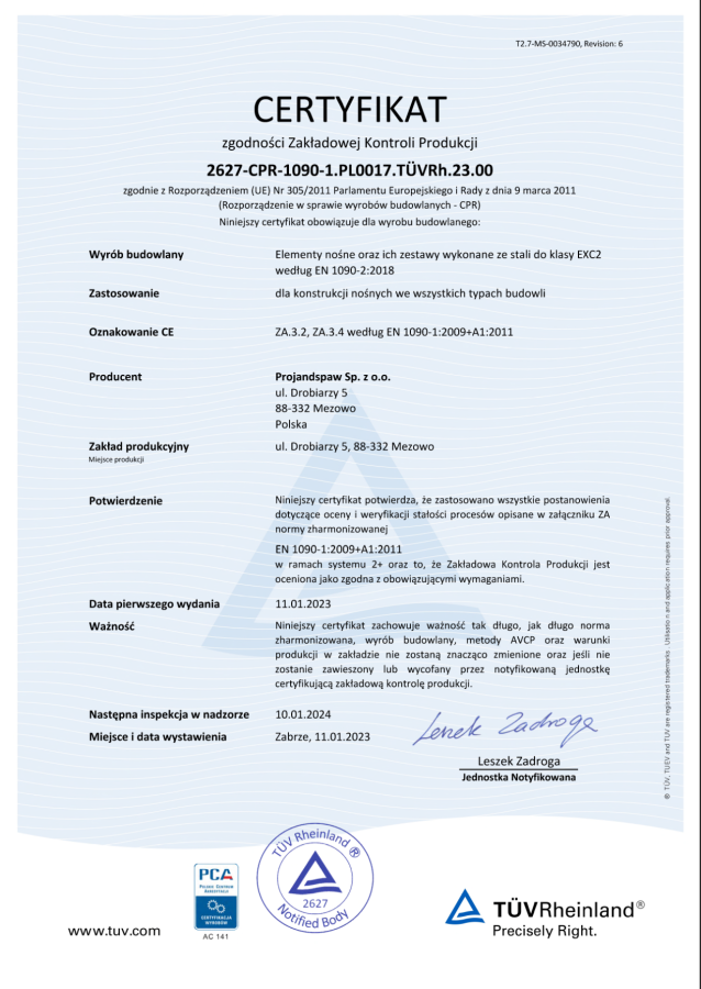 EN 1090-1,2 — Potwierdzenie wymagań dla elementów nośnych wykonanych ze stali dla klasy EXC-2