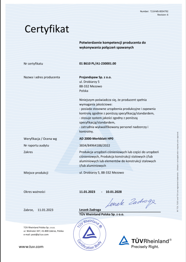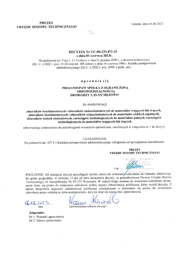 Uprawnienia UDT — Wytwarzanie, modernizacja oraz naprawa rurociągów oraz urządzeń ciśnieniowych dedykowanych do substancji łatwopalnych, żrących i toksycznych.