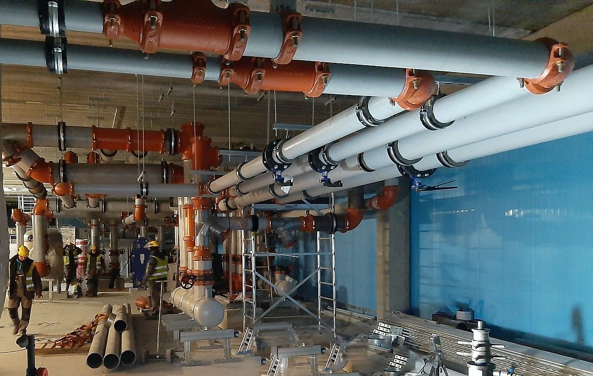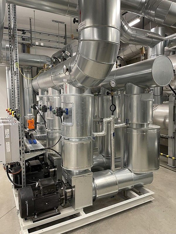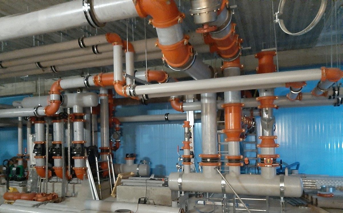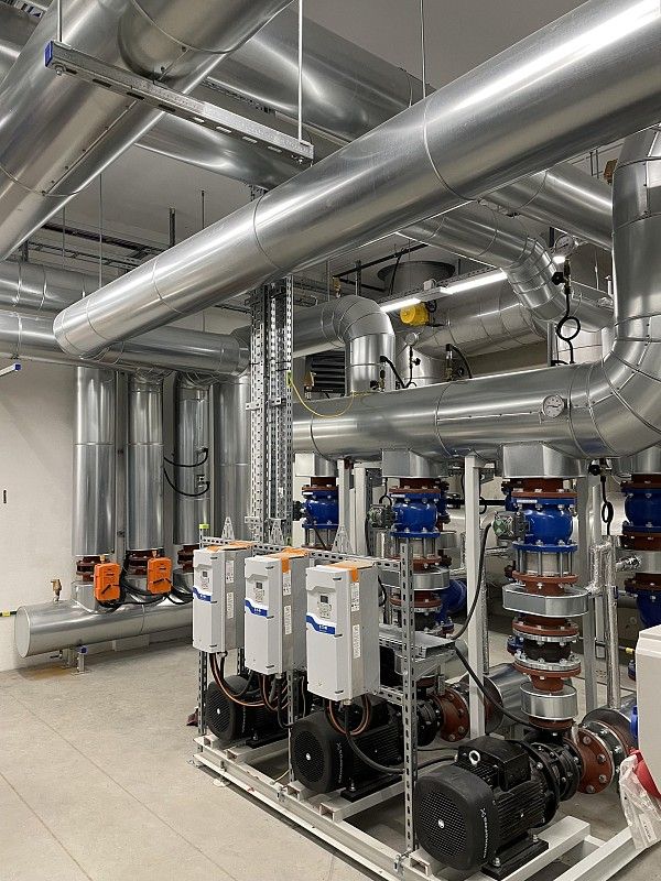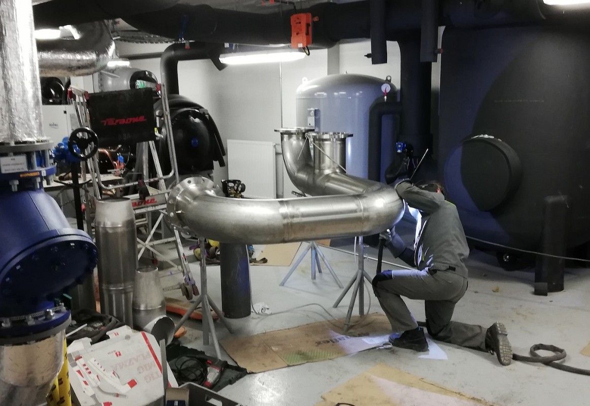 Wykonanie instalacji maszynowni wody lodowej. Instalacja wykonana za pomocą rowkowanego systemu łączenia rur firmy Victauclic.